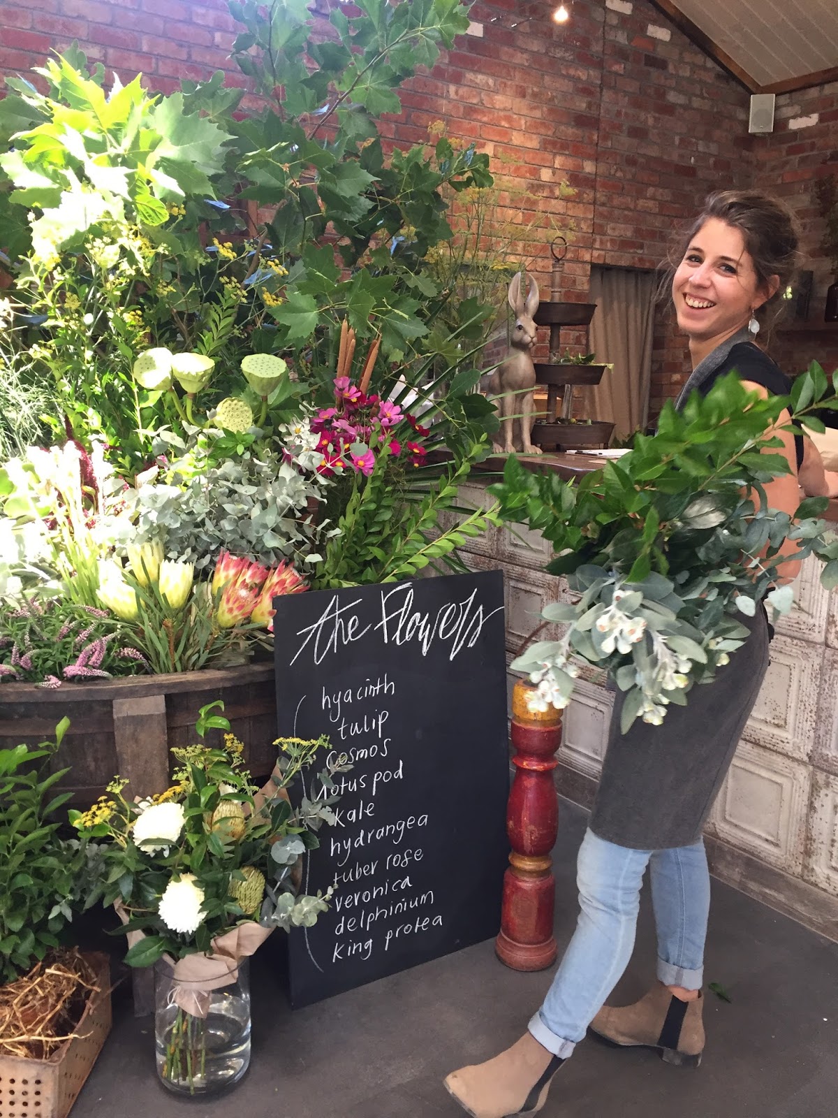 Coffee, a cheese platter  & respite from the rush of work. Moving outside to enjoy the surrounding countryside of tree lined avenues and paddocks. the trees are very European and used to break the cold winds and probably even helped protect the fields from frost bite. (stopping the sun hitting the frost on the grasses & plants). Then we drove down the avenue on to Meletos , Napoleones Brewers. Apple trees! Feeling like a school girl seeing the apples growing on trees, I got my happy snaps. I've seen plenty of fruit trees fully laden, even grown my own, but apple trees aren't very common in Brisbane or North Queensland. Marine creates floral arrangements at The Providor at Meletos.